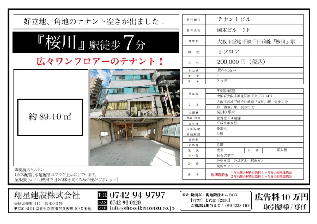 | 交通 | 大阪市営地下鉄千日前線「桜川」駅 徒歩7分 JR「難波」駅 徒歩9分 |
